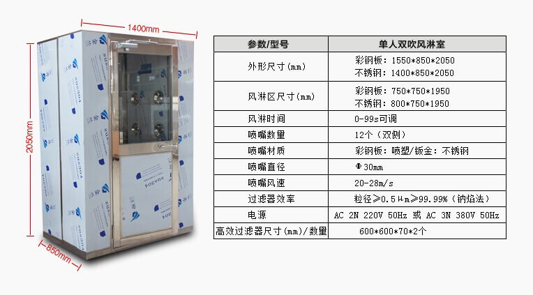 单人双吹风淋室是一种净化设备,是为工作人员进出洁净区所设置的专用通道,可以有效清除人身和物体表面的尘埃,减少带入洁净室的灰尘量。同时起到气闸室功能,防止不清洁空气侵入。以配合洁净空调系统,确保洁净室达到所需洁净度。